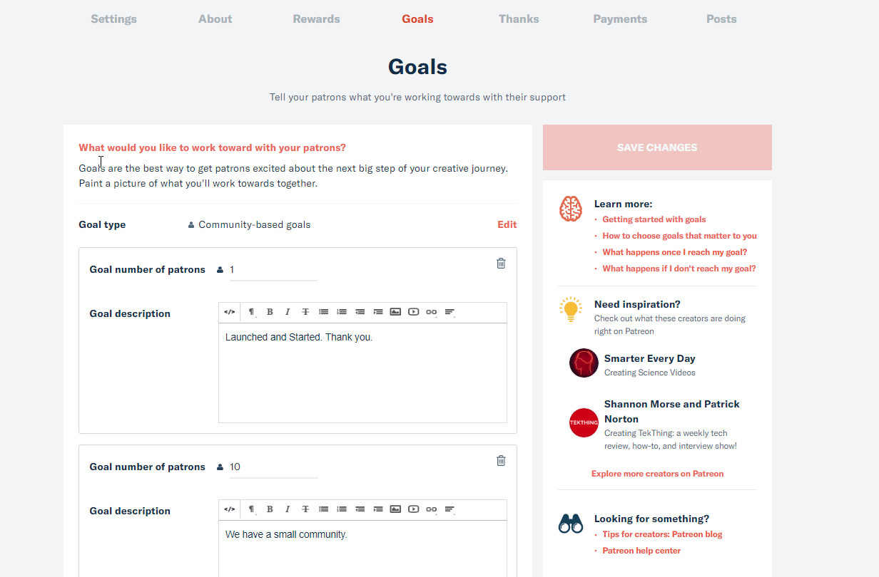 Goals can help gamify your page and your patrons might promote you to help you reach your goals. They are mainly around ’number of people’.
