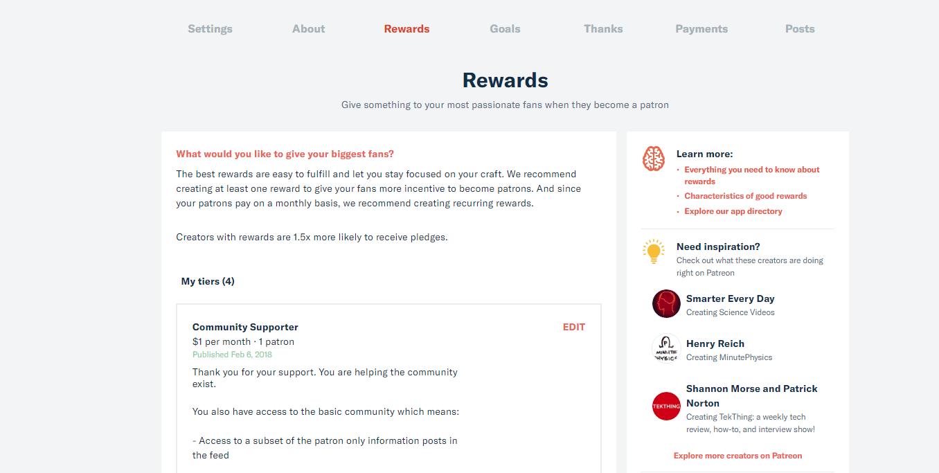 And then you can add as many tiers as you want, but make sure the rewards are things they will only get from Patreon and not stuff you are going to post to YouTube or your blog. Unless you have fanatical fans that really want to pay you for your content in which case that might work.