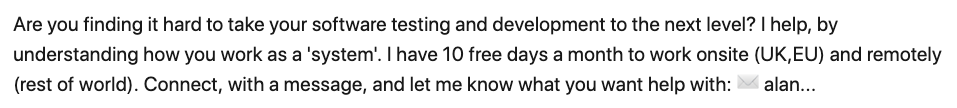 I have 10 free days a month to work onsite (UK,EU) and remotely (rest of world). Connect, with a message, and let me know what you want help with: ✉ alan@compendiumdev.co.uk