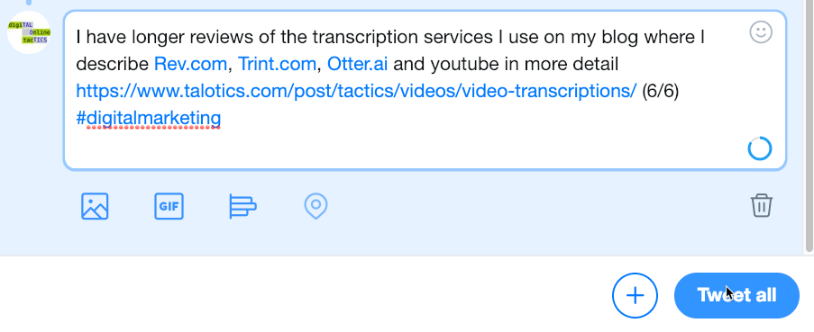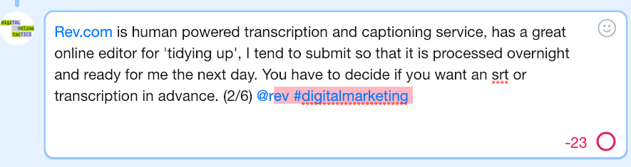 I have longer reviews of the transcription services I use on my blog where I describe Rev.com, Trint.com, Otter.ai and youtube in more detail https://www.talotics.com/post/tactics/videos/video-transcriptions/ (6 / 6) #digitalmarketing